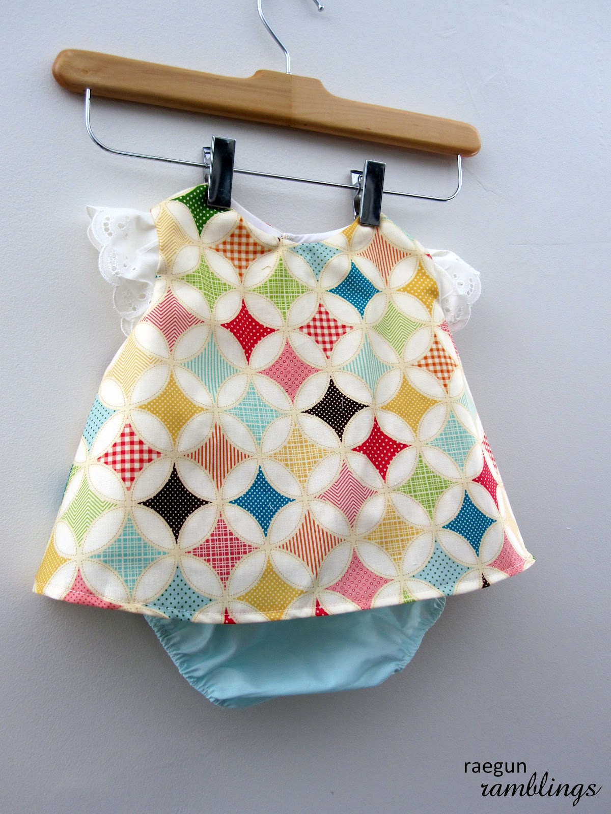 So the night before the shower (as is always the case with gifts and personal sewing projects) I made these. I started with the little swing top and wrap around bottoms set but I just was so in love with the fabric that I kept going. The patterns screamed for something happy like balloons so next came the onesie and I figure a girl can never have too many clothes so I made a pair of red bloomers too for good measure.