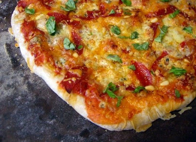 Today we needed a smaller dinner so I pulled out some of my 5 minute bread dough and made a pizza. Topped with pepperoni (zapped and sliced to get rid of some of that grease), jack, cheddar, blue cheese and pine nuts finished with some more basil.